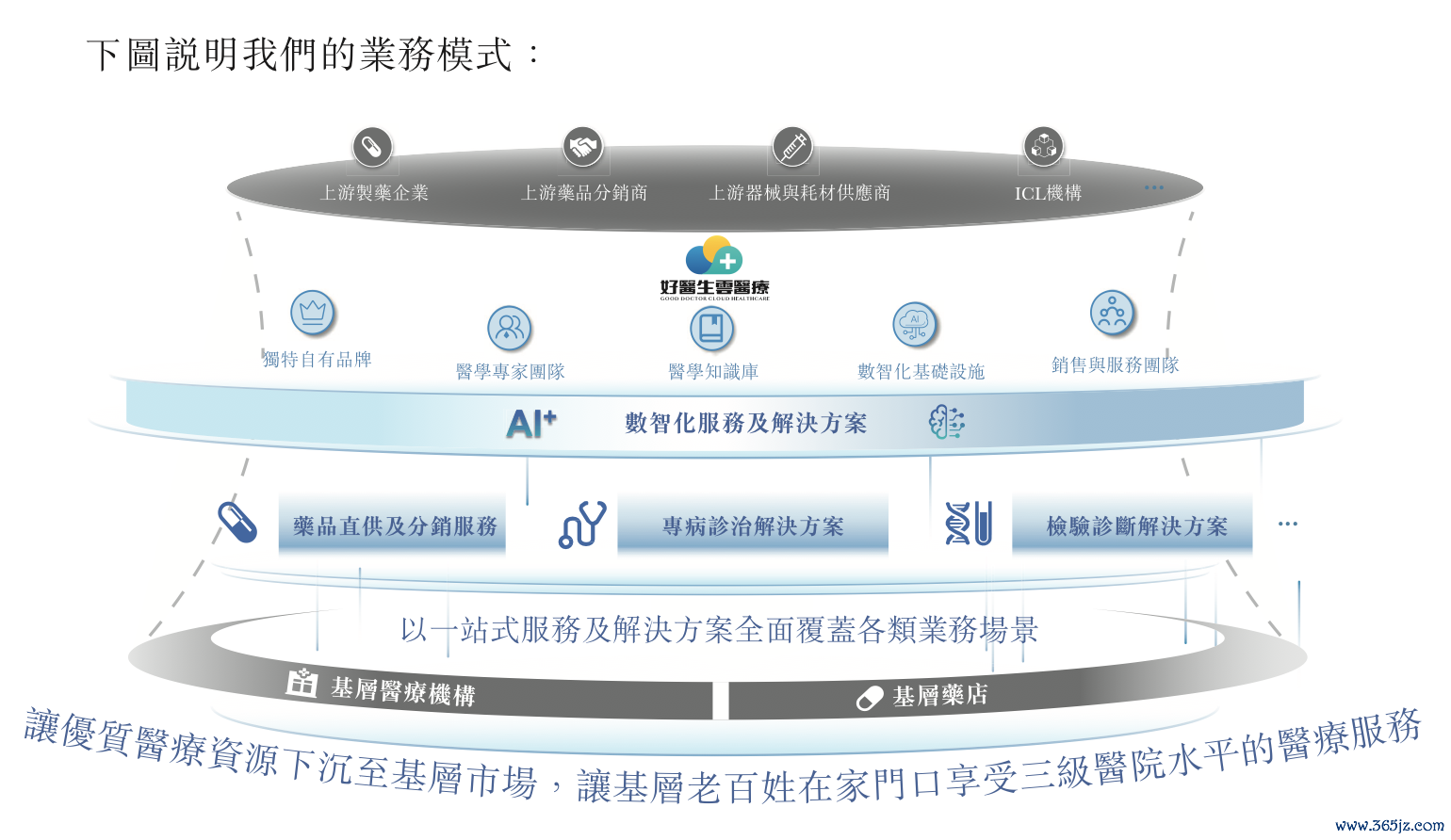 根据灼识咨询数据,好医生云医疗是中国基层医疗行业中唯一实现检验、诊断、用药及诊疗一体化业务场景全覆盖的服务及解决方案提供商。以2024年收入计,公司在国内基层医疗药品直供市场排名第二。