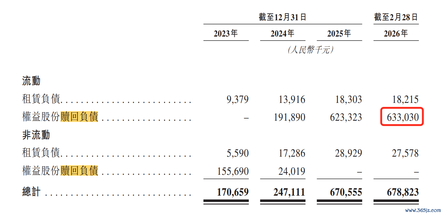那么,这一笔费用有多大规模呢?根据招股书显示,截至2026年2月28日,公司权益股份赎回负债达6.33亿元,占到了公司总债务的九成以上,足见对公司造成的压力。