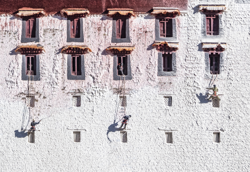 近日,西藏布达拉宫迎来一年一度的粉刷“美容”。工作人员和志愿者将粉刷材料按比例混合,经过滤后对布达拉宫墙体进行喷涂,让建筑更加美观。