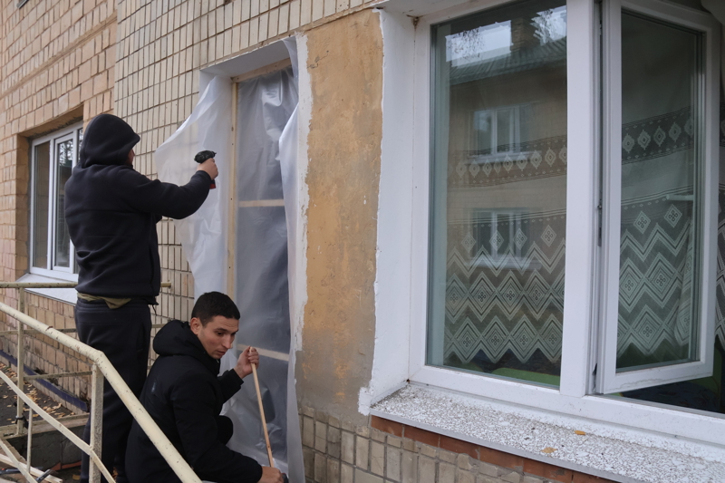 10月25日,乌克兰基辅第聂伯区,民众加固在空袭中受损的门窗。 新华社 彼得·德鲁克 摄