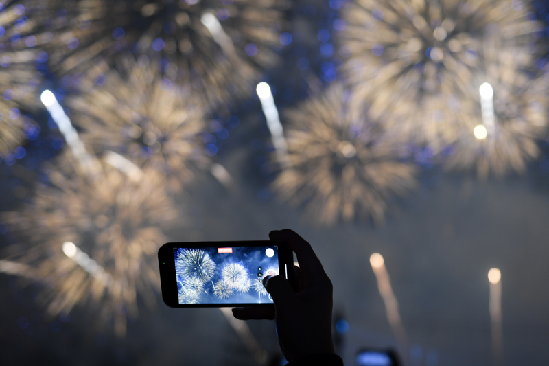 10月24日,观众在拍摄烟花表演。\n 新华社 陈振海 摄