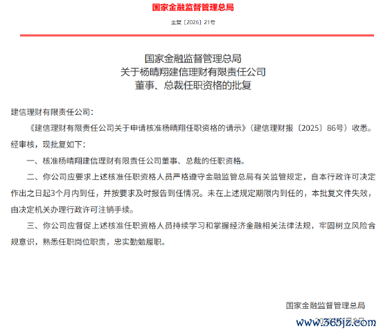 1月23日金融一线消息股利网,国家金融监督管理总局发布关于杨晴翔建信理财有限责任公司董事、总裁任职资格的批复,核准杨晴翔建信理财有限责任公司董事、总裁的任职资格。